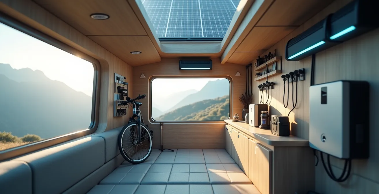 Die üblichen Ratschläge erschöpfen sich oft in der Nennung dieser Komponenten. Doch als auf Solartechnik spezialisierter Elektriker weiß ich: Der Teufel steckt im Detail. Die eigentliche Herausforderung liegt nicht im „Ob“, sondern im „Wie“. Es geht um unsichtbare Feinde wie Anlaufströme, Wirkungsgradverluste bei der Umwandlung von 12V auf 230V und die brutalen physikalischen Kräfte, die auf Ihren Heckträger wirken, wenn Sie mit zwei 25-kg-Bikes über eine einfache Bodenwelle fahren. Die Lösung ist kein einzelnes Gerät, sondern ein systematisches Verständnis der gesamten Kette – von der Solarzelle bis zum Reifenprofil.